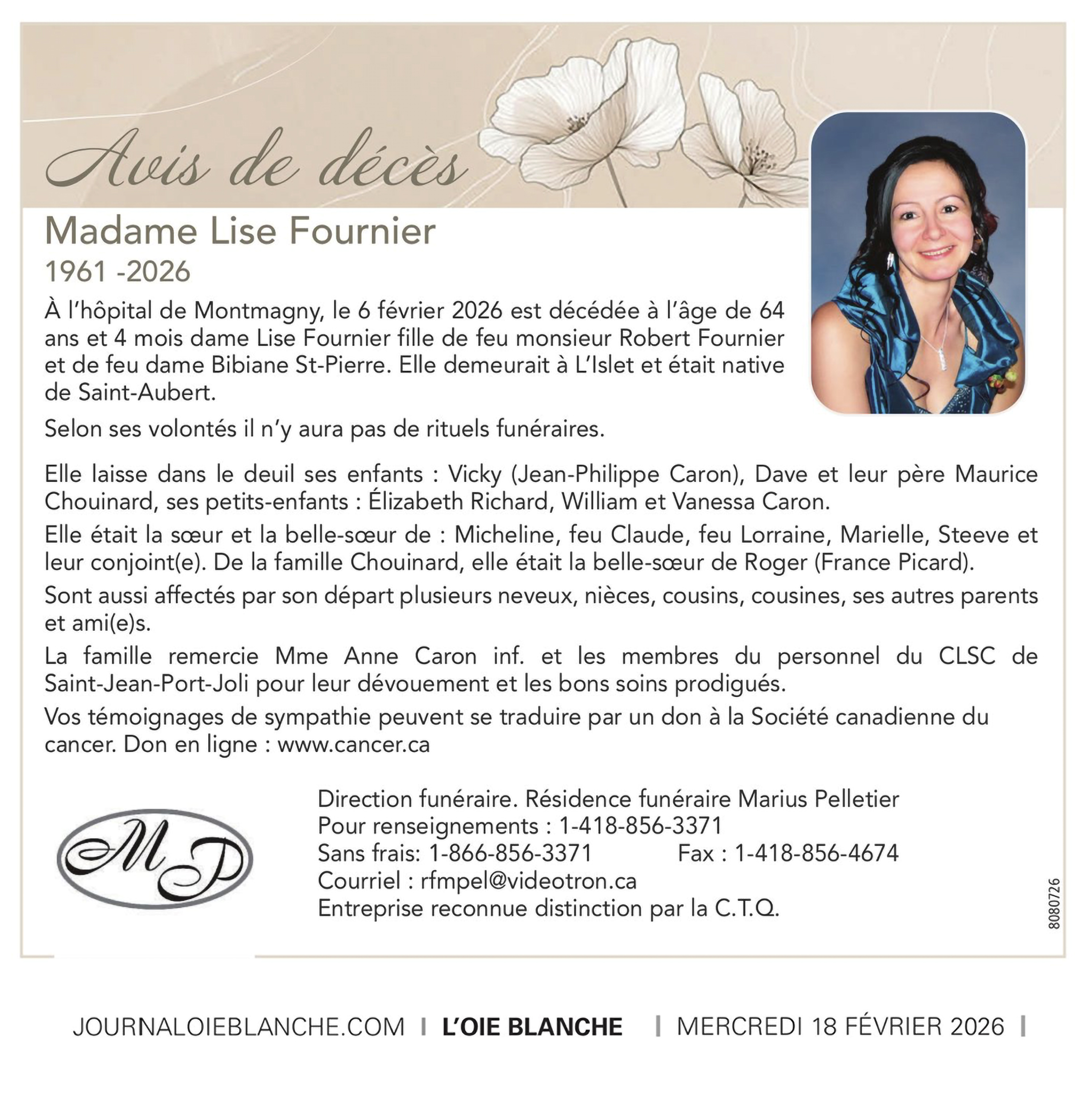 - Fournier Lise (1961-2026) 64 ans 4 mois